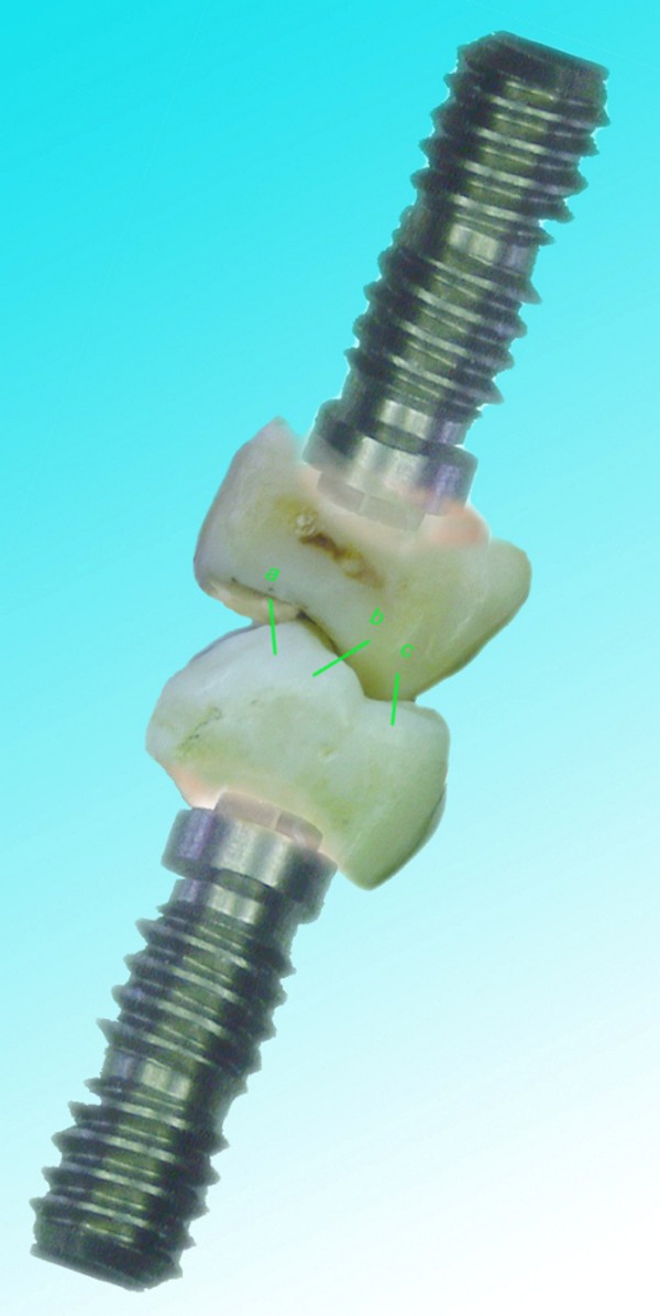 | ![]() La oclusión como etiología de fracasos implantarios.Este artículo pertenece a la categoría: Casos Clínicos Dr. Carlos Acuña Priano RESUMEN Más allá en el tiempo, respecto de las razones más frecuentes de fracasos como temperatura de fresado, infecciones, falta de fijación inicial, falta de higiene, etc., la OCLUSIÓN recibe sobre sí, la responsabilidad de la permanencia de la osteointegración, como así de la ortofunción del sistema todo. Sometimes ago,conserning the most frecuent reason of failures such as the strawberry action temperature, infections and lack of hygiene…etc.,the OCLUSION has itself the responsability af having the osteointegration well as the allsistem ortofunction . DESARROLLO La valoración de los fracasos en IMPLANTOLOGÍA es difícil de contabilizar sobre todo después del año, ya que el confort logrado por lo general, hace que el paciente realice correctamente sus primeros controles, y después; apoyado en su bienestar; intente subconscientemente olvidar ese período de su vida, que si bien le devolvió su capacidad masticatoria, fonética, social, etc., le ocasionara gastos, molestias, sufrimientos. … la APLICACIÓN de dichas fuerzas, requiere de una exactitud mucho mayor. Los esquemas propuestos a través de los años, no son muchos ni muy variados… I-Evitar las fuerzas tangenciales. II-Repartir las fuerzas lo máximo posible. Sin embargo, muchas veces se confunden los conceptos anteriores con criterios inexactos. Por ej: a-Reducción de las caras vestibulares y palatinas, aceptando que la menor superficie de intercontactos reduce la carga. b-Utilización de la Función de Grupo Posterior, en la creencia de que repartiendo el esfuerzo en las piezas posteriores, ganamos resistencia; a la potencia ejercida por los músculos. c-No permitiendo el contacto excéntrico de un canino implantado, para aliviarlo de las cargas laterales, sobre cargando de esta manera la tabla premolar-molar en el Lado de Trabajo. Algunos conceptos aislados, que forman parte de toda una filosofía de la Oclusión (OCLUSIÓN ORGÁNICA), sean tal vez de ayuda para echar luz sobre los preceptos anteriores. 1º-PROPORCIONES FUNCIONALES DE UN PAR OCLUSAL En la figura siguiente, observamos la relación final masticatoria de un PAR OCLUSAL: En el se ven los contactos puntiformes, producto del choque de superficies redondeadas contra superficies redondeadas («Solo pueden encontrarse en un punto» Ref: Principios Mecánicos Esferoidales.W.Mc.Horris.) Si Miramos con atención este tipo de contactos interoclusales, veremos que la superficie actuante es mucho menor que la superficie total de la cara oclusal: 45% (Fig.1) Por lo tanto, si no es por razones del Pilar de Emergencia para no crear un espacio biológico inadecuado… ¿POR QUÉ REDUCIR LA CARA OCLUSAL VESTÍBULO LINGUALMENTE? (Figs. 2-3-4-5) Si observamos con atención las figuras 2-3-4-5, veremos desde todos los planos , que el área contactante es muy reducida respecto del ancho oclusal total, siendo las fuerzas resultantes , AXIALES al eje implantario. 2º-FUNCIÓN DE GRUPO POSTERIOR. FUNCIÓN CANINA. Tres son las razones por las cuales nos inclinamos a la utilización de la Función Canina. En cambio, en el esquema de FUNCIÓN CANINA, podemos observar que el BRAZO DE POTENCIA, es prácticamente igual al de RESISTENCIA, equilibrando de esta manera la palanca y destruyendo mucho menos las estructuras de soporte(Interface I-H) (Fig. 7) Otra de las razones de peso en este tema es la DIFERENCIA DE ANGULACIÓN que existe entre la cara palatina del canino y las vertientes contactantes del sector premolar-molar. A MAYOR ANGULACIÓN, MENORES FUERZAS LATERALES(Perpendiculares al Plano), y por lo tanto , menor destrucción de la interface Hueso-Implante(Figs. 9-11). DIFERENCIAS EXCITATORIAS DE LOS GRUPOS MUSCULARES. Por último debemos considerar que el intercontacto dentario del sector anterior, estimula excitatoriamente a las fibras anteriores y verticales del temporal (Figs.12-13-14-15), mientras que los contactos posteriores lo hacen con la cincha pterigo-maseterina(Fig. 16-17-18-19) Por lo tanto ,si se comprende el fisiologismo de estos conceptos, es sencillo entender que la sobrecarga de los sectores posteriores es nocivo generando fuerzas tangenciales de Alto Potencial Patológico. 3º-FUNCIÓN DE GRUPO ANTERIOR Las ventajas de un Brazo de Resistencia mayor se acentúan cuando tenemos el esquema de FUNCIÓN DE GRUPO ANTERIOR. Además, debemos tener en cuenta que, durante la función de un Ciclo Masticatorio, es más importante la Desoclusión Final que la Desoclusión Inicial, ya que al ser más larga esta última, es durante el transcurso de su deslizamiento cuando se ejercen fuerzas laterales mayores(Fig. 21) A medida que la punta del canino inferior se acerca a la O.R.C., o sea al Punto de Contacto Intercanino, las fuerzas laterales disminuyen en virtud del acortamiento del brazo de potencia de la palanca, hasta que, al terminar su recorrido, la fuerza es proyectada axialmente sobre el eje del canino superior, debido a que, al margen de la intensidad que la fuerza trae durante el cierre, la dirección de la misma «apunta» en esa dirección. Por eso decimos que los caninos Axializan el Ciclo Masticatorio. Si estamos imitando en lo posible a la naturaleza, no olvidemos este detalle que los dientes naturales provéen, para evitar las fuerzas laterales del canino a la hora de realizar la supraestructura coronaria del mismo. Es ahora menester acentuar que la problemática concreta se manifiesta, no durante la función, sino durante la PARAFUNCIÓN… Cuando estudiamos recorridos de la Dinámica Mandibular, desde el conocido Bicuspoide de Posselt hasta cualquiera de los registros pantográficos, estamos invirtiendo la dirección del movimiento… A.- El primer premolar es el más anterior de la tabla oclusal posterior. Por lo tanto el brazo de resistencia es el mayor de dicha tabla. B.- El lateral, como parte del g