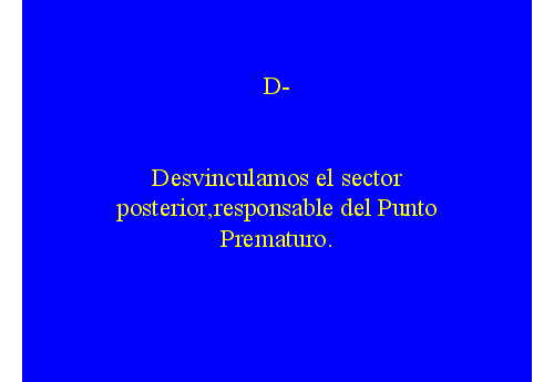 | En ciertas áreas del saber humano, el lenguaje confuso o criptográfico Muchas son las técnicas elaboradas para lograr un desgaste selectivo, y numerosos autores han expuesto en su momento variadas formas de lograr una función oclusal fisiológica mediante el ajuste de la misma. Han pasado años desde entonces y, sin embargo, aún hoy, un altísimo porcentaje de profesionales “navega” por el mar de la confusión oclusal, dada la diversidad de conceptos y escuelas, sin lograr arribar a costa alguna donde poder anclar un conocimiento sólido sobre cómo tratar la oclusión Ya se esté realizando una simple obturación, endodoncia, incrustación, radectomía u ortodoncia, la lógica pocas veces, en la mayoría de los casos, vincula un tratamiento con otro, siendo el resultado final el mismo caos inicial; enmascarado por mucho tratamiento profesional. El ajuste oclusal es un medio inicial de proveer al sistema enfermo de: Dicha técnica, que puede ser terapéutica en sí misma; consta de dos etapas, a saber: 1) Ajuste Oclusal por Adición Mediante el estudio de la guía anterior, encargada de efectuar las Disclusiones durante las excursiones mandibulares, podremos observar si ésta es funcional o no. • Marcas de carácter continuo, si en ese recorrido se produce la Disclusión de los sectores posteriores y todo marcha correctamente. FIG 1-2 Si por el contrario observamos: • Marcas de carácter discontinuo, significa que dicha Disclusión se está efectuando por medio de una pieza dentaria posterior a la guía anterior. FIG 3-4-5 (FIGS. 3, 4 Y 5). En la figura 6 las flechas indican, en un caso clínico de análisis oclusal, la presencia de marcas discontinuas que indican Interferencias en Propulsiva. FIG 6-7 Y por último, si existieran: • Abrasiones de las áreas discluyentes en las áreas de diagnóstico de la guía anterior, deberemos aportar material a dicha zona para no permitir el choque lateral de las piezas posteriores (Ajuste Oclusal por Adición) En las imágenes 11 y 12 podemos observar la adición de composite en la punta de un canino derecho, previa la observación de la Faceta Parafuncional remarcada durante el análisis oclusal en el articulador. (FIGS. 8 A 12). 2) Ajuste oclusal por Sustracción o Desgaste Habiendo cumplido ya con la verificación de la funcionalidad de la Guía Anterior, comenzamos los desgastes en céntrica, a fin de lograr un único arco de cierre, guiado eficazmente por la Guía Anterior; es decir: la coincidencia entre Oclusión Habitual y Oclusión en Relación Céntrica. En este caso, intentar gastar dichos puntos, de ser posible sólo en las cúspides de corte o no fundamentales: • Crestas Triangulares Internas, Cúspides Vestíbulares Superiores • y un poco de las Crestas Triangulares Internas, Cúspides (FIGS. 13 A 16). Si la deflección es hacia el lado opuesto, se invierten los desgastes. En las migraciones hacia adelante, las únicas razones posibles están en los puntos estabilizadores (FIG. 17); es decir: -Vertientes Distales de los Rebordes Marginales, Triangulares (FIG 17) (FIG 18 A-B-C-D) Obsérvese cómo, en una boca prácticamente entera, comienzan a “desmoronarse” prismas adamantinos (FIG. 19), como consecuencia de un punto prematuro de contacto, ubicado en la posición de un estabilizador, que provoca la discrepancia horizontal postero-anterior causante de dicho efecto (FIG. 20). FIG 19-20 Dicho punto, será necesario ajustarlo antes de cualquier tratamiento en la zona ¿Cuáles serían las consecuencias si esos incisivos fueran implantados tal como es frecuente observar en múltiples congresos y cursos de implantología, donde el tema de la oclusión no es más que un cuadro polifacético y anecdótico? 14 15 16 17 Todo producto del adelantamiento mandibular Realizados ya los desgastes en céntrica, obteniendo de esta manera un único arco de cierre, es decir, oclusión en relación céntrica, debemos realizar el ajuste de las excéntricas, apoyando la acción de la guía anterior, para lo FIG 22 a. De un lado a otro de un mismo maxilar, la imagen es especular, o sea invertida. b. En hemimaxilares cruzados, la imagen es idéntica. Allí donde existan colisiones entre cúspides, se deberá crear un surco para que dicha cúspide antagonista migre a su través, tanto en el lado de no trabajo, como en el de trabajo y en el de propulsión. FIG 23 Es importante conservar esta parte del surco, ya que si no existieran, los contactos entre cúspides serían en superficie y no puntiformes (fig. 24). FIG 24 1. Obtener un único arco de cierre con coincidencia entre oclusión habitual y relación céntrica. 2. El cierre mandibular debe ser recibido sólo por la tabla premolar-molar. 3. Durante las excursiones funcionales es la guía anterior la que debe sufrir las fuerzas laterales. 4. De cumplirse estas dos premisas debemos obtener libertad de desplazamiento (no confundir con libertad en céntrica) a las piezas posteriores mediante la creación de surcos disclusivos. Examinadas ya las posibles migraciones mandibulares y los desgastes o aposiciones necesarios para poder ocluir en céntrica, es fundamental recordar que, previamente a todo tipo de ajuste, se ha hecho necesario ubicar a la mandíbula en relación céntrica. Para ello debemos utilizar el propio funcionalismo muscular 22 FIG 25 Y esto no significa otra cosa que: piezas dentarias estables en todos los planos del espacio, ATM centrada en la cavidad glenoidea, periodontos sin tensión, músculos en la dimensión de elongación adecuada para un fisiologismo Paz absoluta en la intimidad del Sistema Estomatognático. Y así, como corolario final, es posible establecer una regla de oro similar en importancia a la conocida formula: Forma = Función Ésta es: FIG 26 FUNDAMENTOS NEUROFISIOLÓGICOS DEL REGISTRO DE OCLUSIÓN EN RELACIÓN CÉNTRICA ( ORC) MEDIANTE EL USO DE LAMINILLAS DE LONG CUADRO