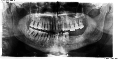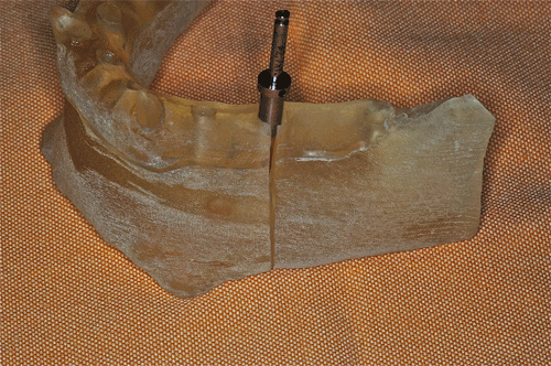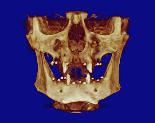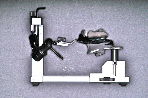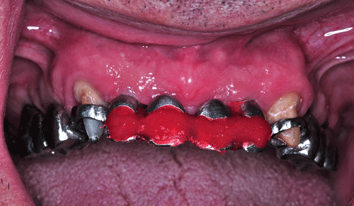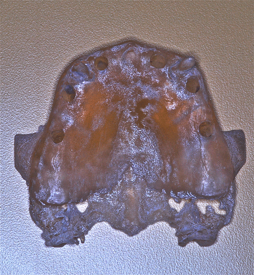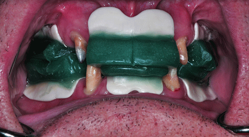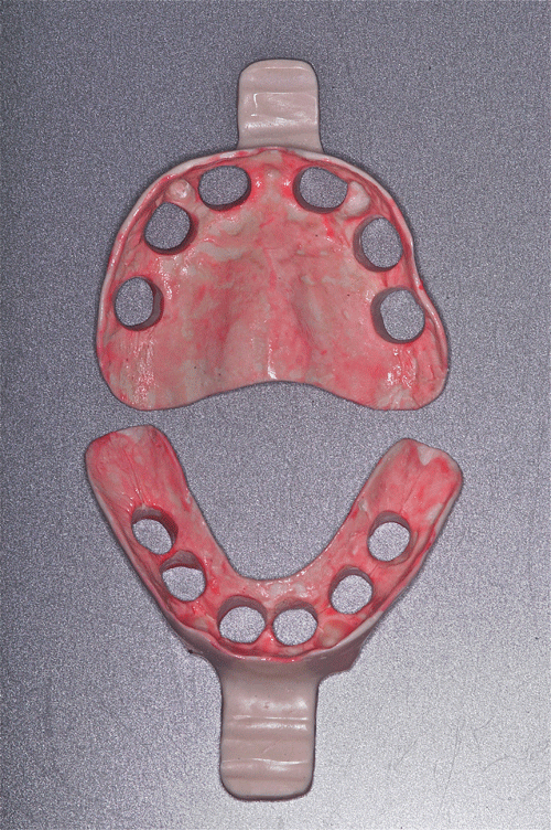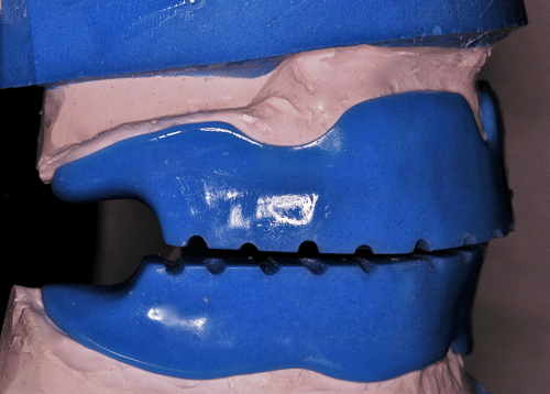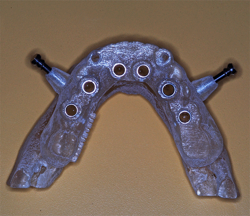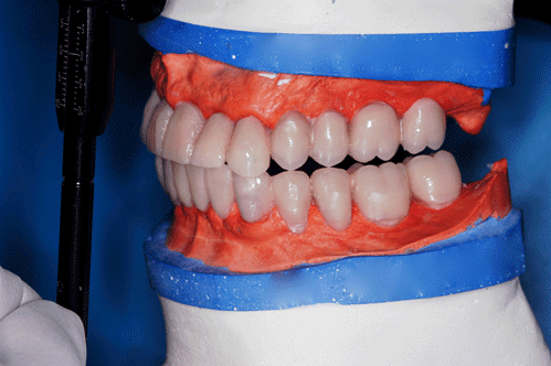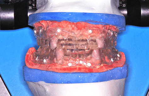 Con esta Guía de Dimensión Vertical convenientemente conservada, procedemos a la edentación total del paciente, pero conservando los cuatro caninos que serán exodonciados una vez que estén confeccionadas las prótesis definitivas. Realizamos un nuevo montaje para la confección de un enfilado dentario a fin de obtener una férula radiológica. …para lo cual recurrimos a las guías de dimensión vertical para reestablecer la D.V. original. Dicho enfilado debe cumplir los requisitos disclusivos necesarios del trabajo final. Obtenida la férula procedemos a un TAC que nos revele el estado óseo del enfermo… …y a la realización, mediante un programa de cirugía guiada a la construcción de las férulas quirúrgicas sobre modelos estereolitográficos, lo que nos permite operar previamente a dichos modelos. Férula quirúrjica Mod. estereolip. operado Férula quirúrjica Mod. estereolip. operado Comprobación de no lesióna