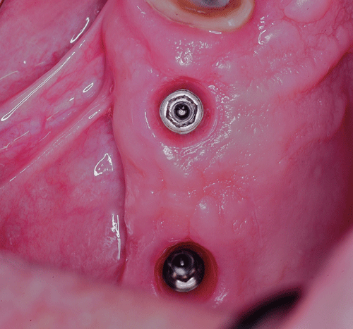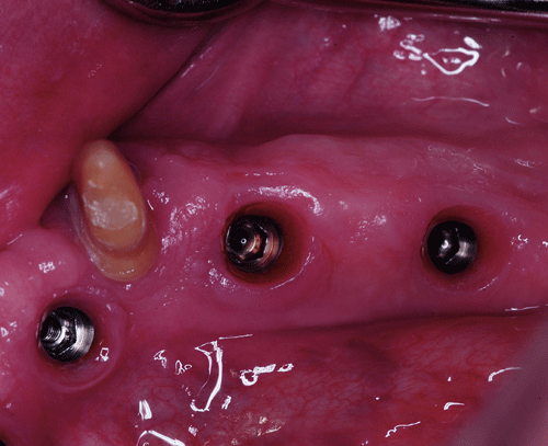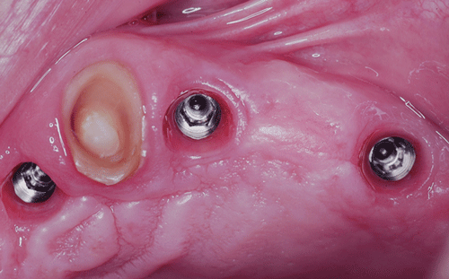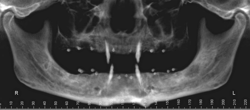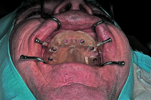 Realizamos entonces el campo quirúrgico apropiado e instalamos las férulas quirúrgicas. y procedemos a la implantación quirúrgica guiada, implantando solo hasta los primeros molares.(ya que cuanto mas anterior es la masticación, las fuerzas masticatorias son menos lesivas para las estructuras creadas. Palanca clase III) O.P.M. Post Operatoria