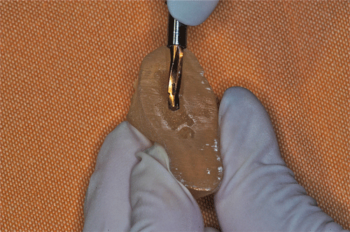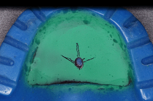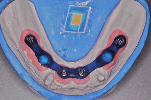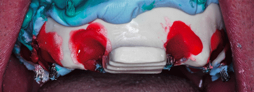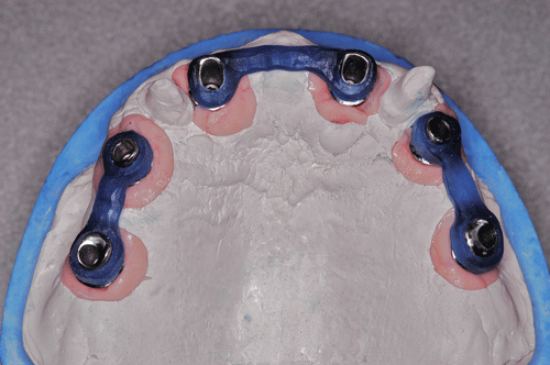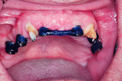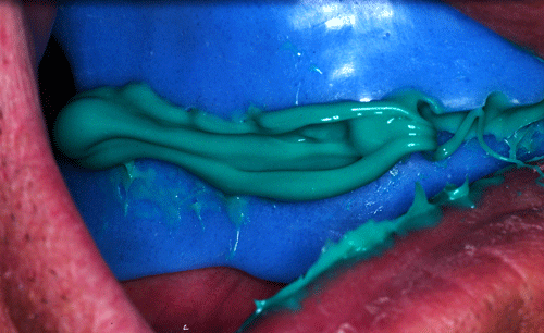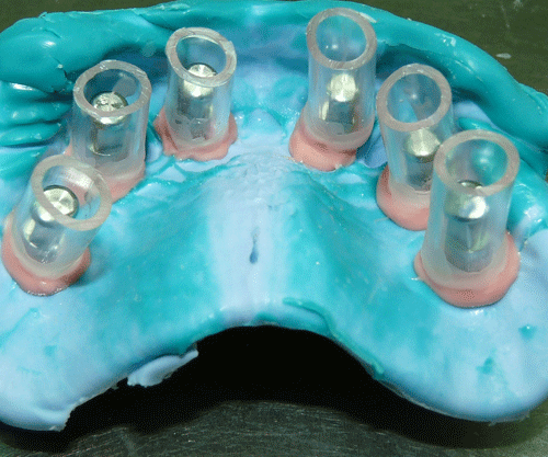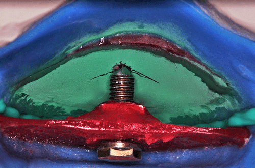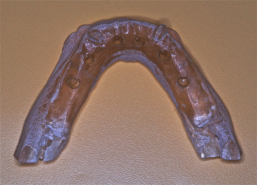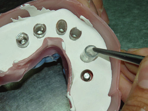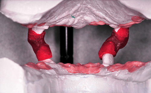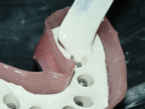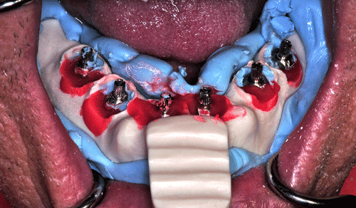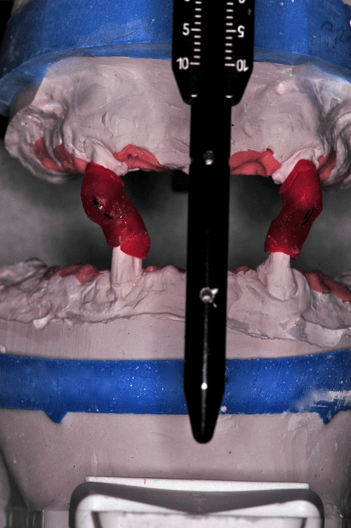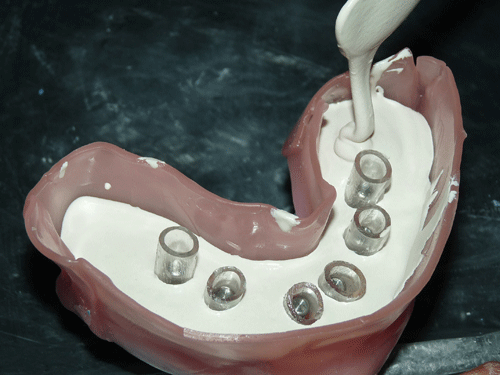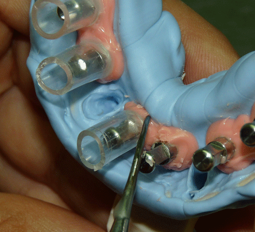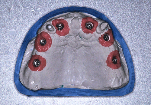 Destacamos, que durante todo el proceso nos vimos obligados a realizar rápidas endodoncias en los cuatro caninos que ya presentaban síntomas dolorosos, disgregación de sus infundíbulos(lo que nos lleva a sobre obturar), y cierta radiolucidez periodontal. Comenzamos ahora con los procedimientos de pasividad protética. A-DURANTE LA TOMA DE IMPRESIONES. Primer método de obtención de pasividad Primer método de obtención de pasividad B-DURANTE LA CONFECCIÓN DE LOS MODELOS Segundo método de obtención de pasividad Segundo método de obtención de pasividad Segundo método de obtención de pasividad Segundo método de obtención de pasividad Segundo método de obtención de pasividad