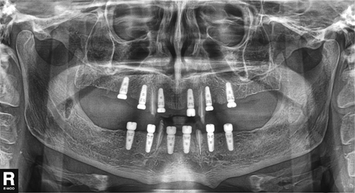 Obtenidos los modelos mayores de trabajo, se impone nuevamente montarlos en ORC. Podemos observar una vez mas al tomar los Registros Intermaxilares, que durante el cierre bucal inducido (maniobra de Dawson) el paciente indenta mas allá de su DV inicial. Debido a que durante el transcurso de la rehabilitación, alguno de los caninos sufrió roturas que pudieron alterar la altura( que fueron compensadas mediante rebasados de las guías de DV), sumado al desgaste lógico de los provisionales, pensamos que es posible que la relación céntrica muy vinculada a la dimensión vertical haya sido alterada, por lo que corroboramos el estado posicional de las ATM, mediante el grabado de un Arco Gótico de Gysi, por medio del sistema BO.P.Y.A.C.U. que consiste en unos “rodetes rígidos” con muescas para la obtención de la fijación del registro, en los cuales se adiciona una bóveda palatina al superior y una púa inscriptora en el inferior. BO.PA.Y.C.U BO.PA.Y.C.U BO.PA.Y.C.U Sabemos por dinámica de las ATMs., y del estudio del Arco Gótico de Gysi, que el punto donde confluyen todos los movimientos,(que es aquel de donde parten todas las excursiones mandibulares intra bordeantes), es la Relación Céntrica Mandibular, la que con nuestra reconstrucción debemos hacer coincidir con la Oclusión Céntrica Dentaria para que la masticación se produzca dentro de un rango fisiológico articular. Arco gótico de Gysi Arco gótico de Gysi Relación céntrica Corroborando una vez mas la dimensión vertical(Espacio Libre Interoclusal) Recuperación de la D.V. original En este punto, con una fisiológica posición de nuestra ATM en su zona mas centrada (RC) y nuestros músculos en una elongación fisiológica(DV), podemos ya comenzar con el trabajo protético(que será la oclusión que daremos al caso en las RC y DV adecuadas), el que iniciamos verificando en primer término la salud de los tejidos peri implantarios (por color y carencia de hemorragias) y la integración eficaz de los implantes (por golpeteo). Procedemos luego a una prueba estética de sus futuras prótesis. Inmediatamente después, probamos los pilares(abuttments) mediante una férula de posicionamiento, dejando en el inferior libres los espacios para dos broches de presión, ya que la prótesis inferior será removible. C-DURANTE LAS PRUEBAS DE SUPRAESTRUCTURA Para luego probar la meso estructura bipartita( para ser soldada en boca y obtener pasividad). 3º método de obtención de pasividada 3º método de obtención de pasividada 3º método de obtención de pasividada Una vez montada la porcelana, verificamos las disclusiones según el esquema de OCLUSIÓN MUTUAMENTE COMPARTIDA(Axialidad-Estabilidad-No Interferencia-Alineación Tridimensional-Centricidad Mandibular) O.R.C.(Oclusión en relación céntrica Disclusión canina izquierda Disclusión canina derecha Propulsión Y la Organización Oclusal concebida previamente: Alineación tridimensional Alineación tridimensional CONCLUSIONES BIBLIOGRAFIA 1-Kent G.,Johns R. Effects of osseointegrated implants on phychological and social wel-being: a comparison with replacement removible protheses.int J Oral Maxillofac Implants 1994;9:103-106 2-Jemt T, Leckholm U. Implant treatment in edentulous maxilla:a 5-year follow up report in patients with differents negrees of jaw resorption. 3-Velazco E, García A, Segura JJ,Medel R,España A.Cirugía Guiada y carga inmediata en implantología Oral.I. Consideraciones diagnósticas y quirúrgicas.Rev. Esp. Odontoestomatol de Impl 2008;16:211-8 4-American Academy of Oral and Maxcillofacial Radiology.Selection criteria for dental implant site Imaging:A position paper of the American Academy of Oral Maxillofacial Radiology.Oral Surg Oral Med Oral Pathol Oral Radiol.:indod 2000;89:630-7 5-Michael R. Norton Carole Gamble Clin. Bone clasification: an objetaive scale of bone density using the computerized tomography scan. Oral Impl.Res. 12, 12001; 79-84 6-Alonso A.A.;Albertini J.S.;Bechelli A.H.:Oclusión y diagnóstico en rehabilitación oral,Panamericana,1999 7-Ash M.M.;Ramfjord S.:Oclusión.Interamericana,1996 8-Capuselli,H.O.;Schuvartz,T.:tratamiento del desdentado total,3º edición.Mundi,1987 9-Jacobson,T.E.;Krola ,A.J.:Contemporary review of the factors envolved in complete denture retention, stability, and support, Part I;Retention.J.Prosthet.49:5-15,1983 10- JacobsonT.E.;Krola ,A.J.:Contemporary reviewof the factors envolved in complete denture retention, stability, and support, Part II;Stabillity.Prosthet.49:165-172,1983 11- JacobsonT.E.;Krola ,A.J.:Contemporary review of the factors envolved in complete denture retention, stability, and support, Part III;Support.Prosthet.49:306-313,1983 12-Saizar P.:Prótesis a placa Tomo I,3º Edición. Progrental, 1940 13-Alvarez Cantoni,H y colaboradores:Fundamentos ,técnicas y clínica en Rehabilitación Bucal.Preparaciones Racionales en Prótesis Parcial Fija( tomo I),Editorial Acheace,1999 14-Hanau R.L:Occlusal changes in centric relation,J.A.D.A.XVI,p 1903.1929 15-LuciaV.O.:Técnica para el registro de relación céntrica.J.Prosthet dent.1964;14:492 16-Martinez Ross:Sisfunción temporomandibular.México:Taller editorial,1978 17-Shillimburg H.;Hobo:Fundamentos de la prostodoncia fija.Chicago:Quintaessence, 1978 18-Alvarez Cantoni,H.; Fassina N.; y colaboradores:Collección Fundamentos , Técnicas y Clínica en Rehabilitación Bucal;Tomo II; Prótesis Total Removible, cap.II-III-,editorial Acheace 2002 19- Alvarez Cantoni,H.; Fassina N.; y colaboradores:Collección Fundamentos , Técnicas y Clínica en Rehabilitación Bucal;Tomo II; Prótesis Total Removible, cap.V-XII;editorial Acheace 2002